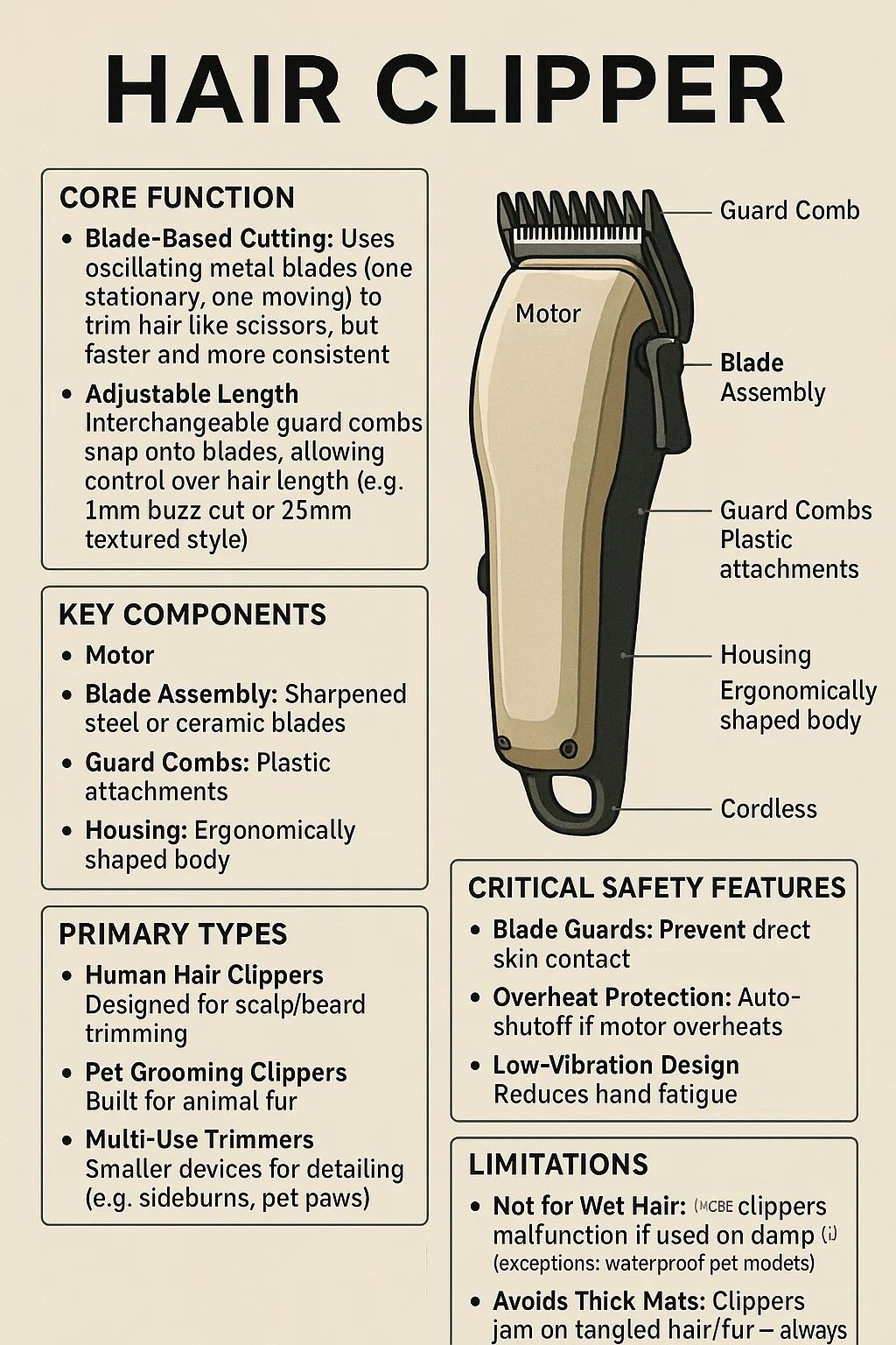 에이 헤어 클리퍼 머리카락을 효율적이고 균일하게 자르도록 설계된 전기 손질 도구입니다. 다음은 핵심 기능과 용도에 대한 자세한 내용입니다.