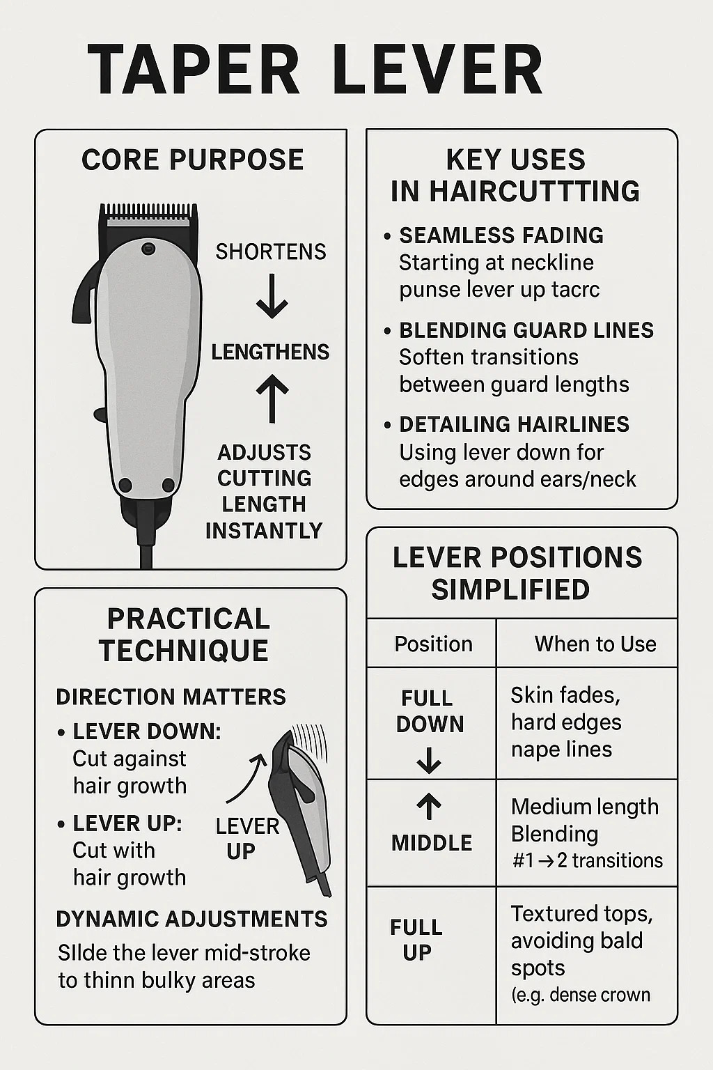 레버가 켜져 있습니다. 머리깎기 (테이퍼 레버 또는 칼날 조정 레버라고도 함)은 전문적인 이발에 필수적인 정밀한 기능을 제공합니다. 다음은 실제적인 분석입니다.