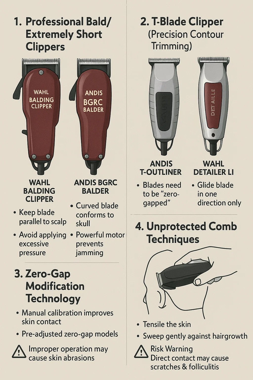 Wahl Balding Clipper: 극도로 짧은 모발용으로 설계되었으며 #2105 수술용 칼날이 장착되어 있습니다. 가늘고 날카로운 치아로 인해 두피가 밀착되어 거의 대머리 효과를 얻을 수 있습니다. 사용 중에는 면도날을 두피와 평행하게 유지하고 과도한 압력을 가하지 마십시오.